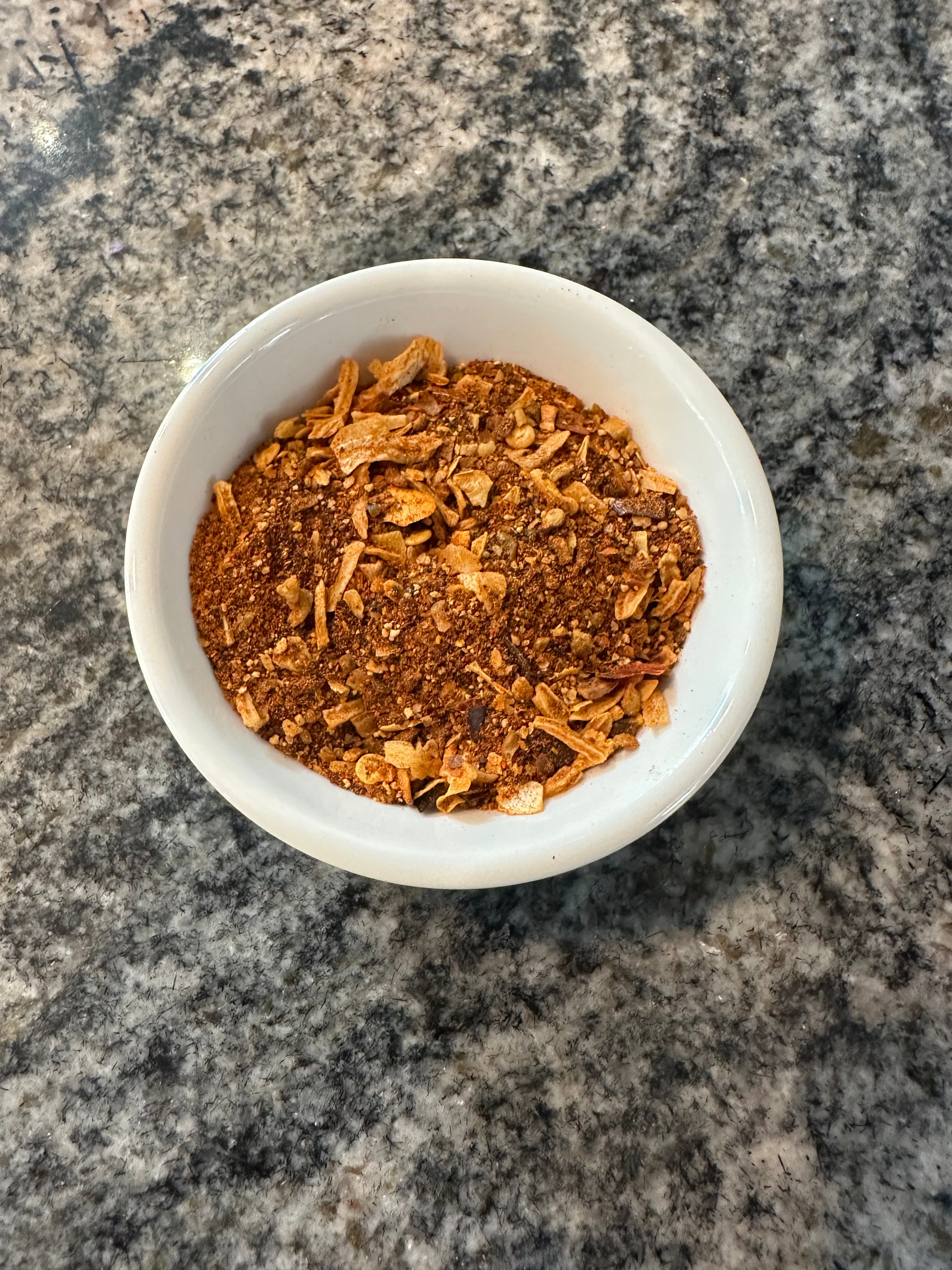 INGREDIENTS: MINCED ONION, CHIMAYO POWDER, CHILI POWDER, KOSHER SALT, SUGAR, BROWNULATED SUGAR , ONION POWDER, DEHYDRATED TOMATO GRANULES, DRIED LIME PEEL, BELL PEPPERS, SPICE, DRIED GUAJILLO MEXICAN PEPPER, DRIED ORANGE PEEL